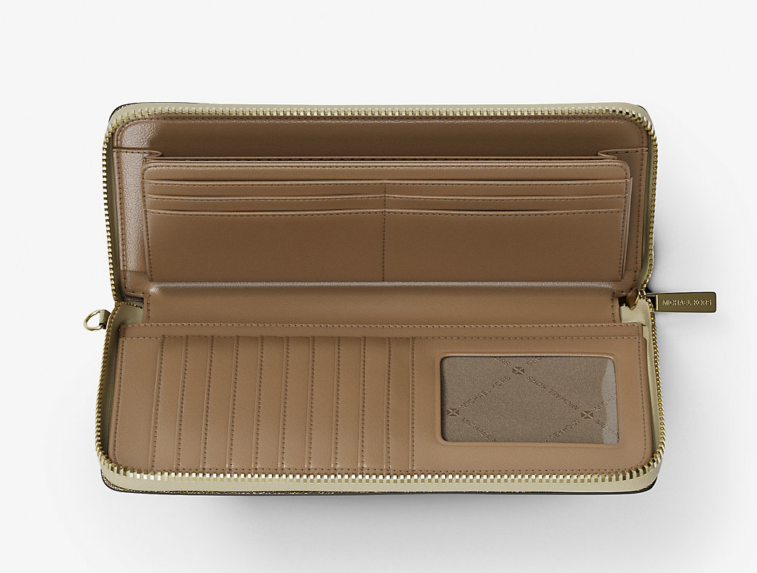 Michel Kors Jet Set Large Metallic Signature Logo Continental Wallet Pale Gold